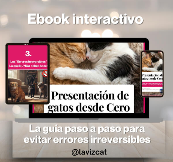 Hola, soy Yeny Vizcaino, conocida como Lavizcat. Me encuentras en redes por @lavizcat.Soy especialista en comportamiento y convivencia felina y llevo más de 5 años ayudando a familias a resolver desafíos de conducta y conflictos entre gatos.Más del 80% de mis consultas llegan por el mismo motivo: relaciones deterioradas entre gatos debido a una mala presentación. Y también he visto cómo hacer este proceso correctamente desde el inicio puede generar resultados completamente diferentes y maravillosos.Por eso creé esta guía paso a paso: para que una decisión tan bonita como llevar un nuevo gato a casa no se convierta en una experiencia estresante ni una pesadilla para nadie, ni para los gatos ni para sus humanos.Aquí reuní la experiencia práctica y el conocimiento que he aplicado ayudando a cientos de familias a lograr convivencias felinas tranquilas y armoniosas.